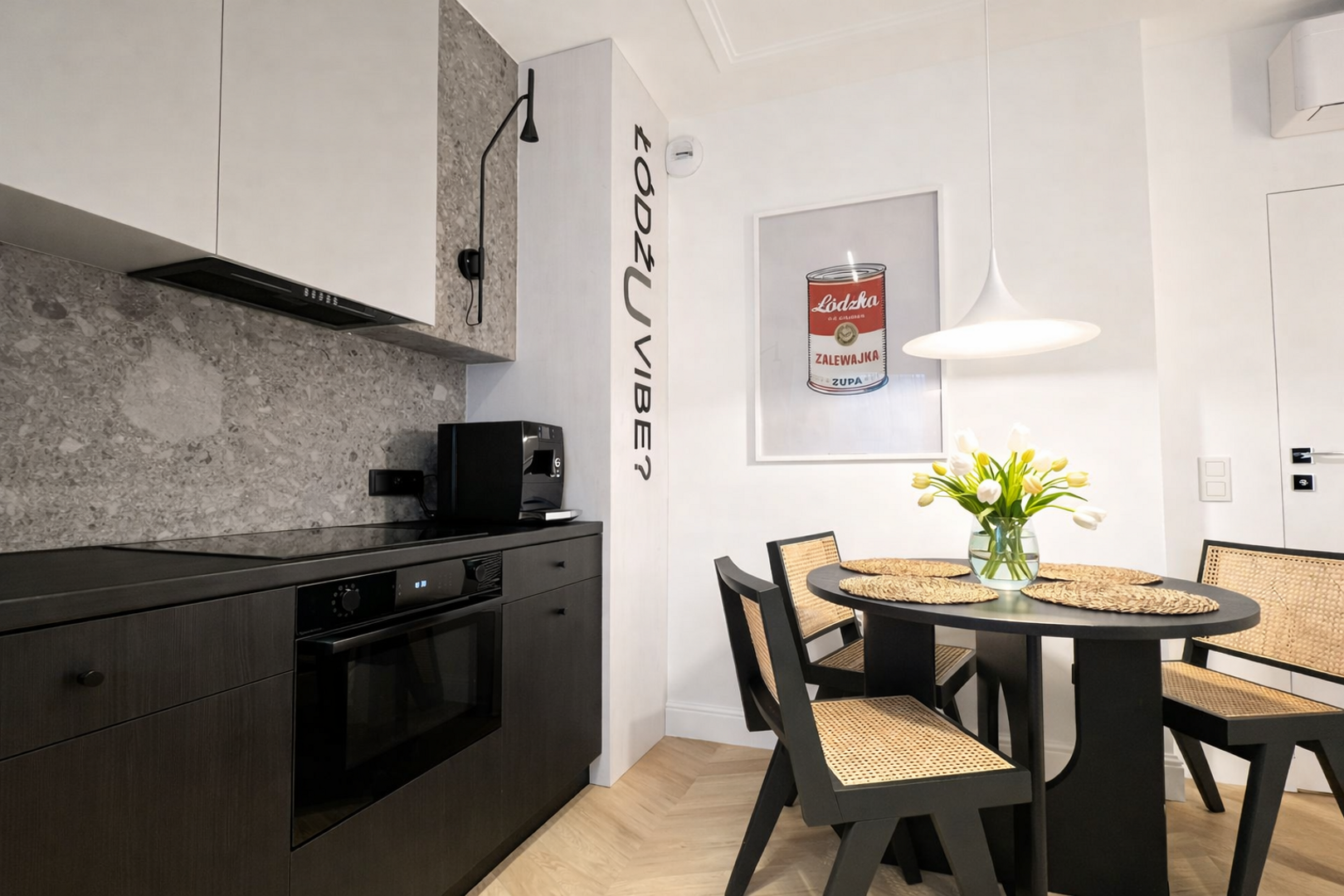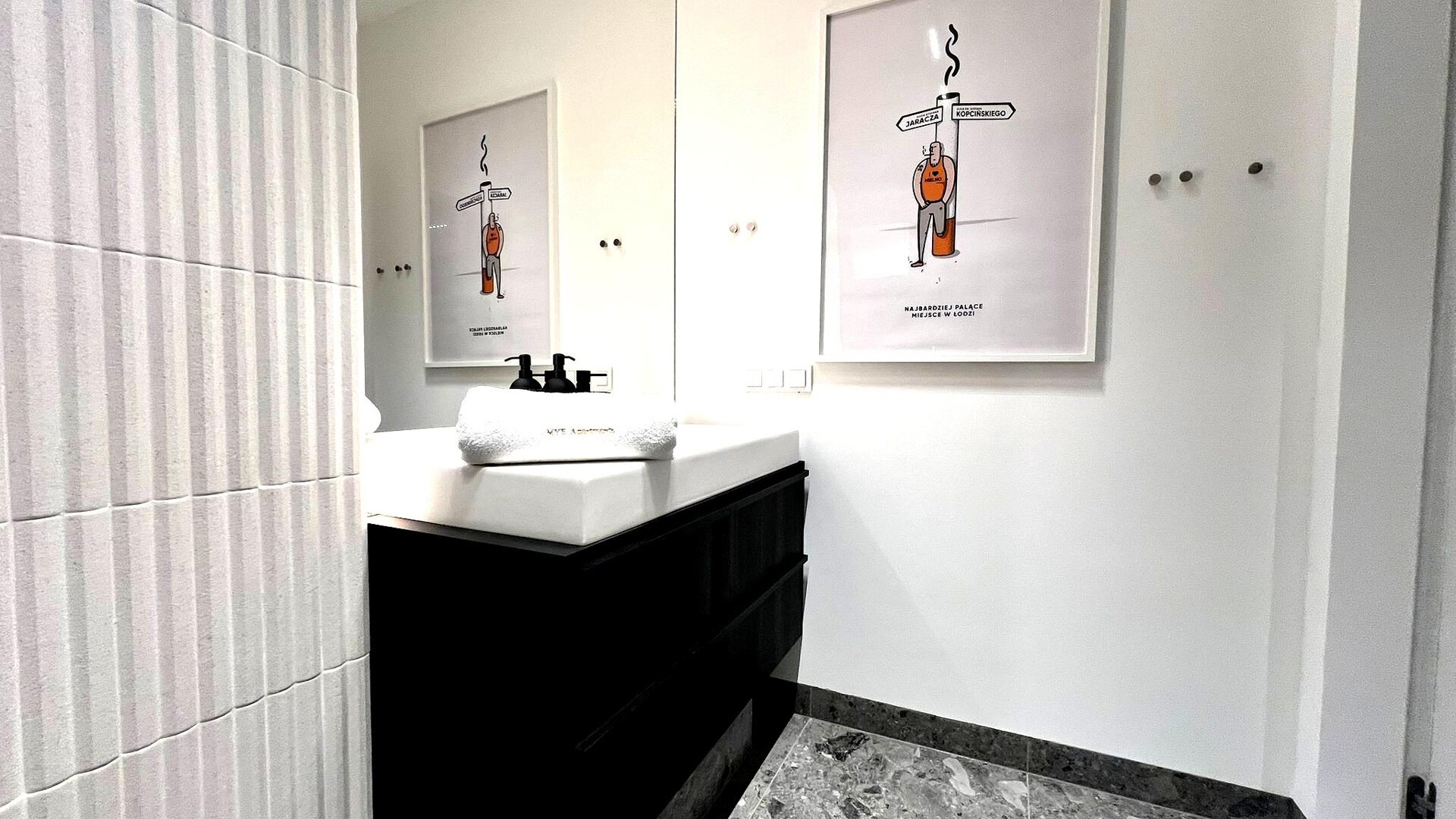 To jednak coś więcej niż tylko funkcjonalna przestrzeń. Apartament zaprasza do świata inspirowanego łódzką kulturą i sztuką. Na ścianach odnajdziesz autorskie grafiki i plakaty – od reinterpretacji Stajni Jednorożców, przez nietuzinkową tablicę Snellena z ukrytymi nazwami łódzkich dzielnic, aż po kultową zalewajkę w pop-artowym wydaniu. To miejsce, w którym możesz poczuć klimat miasta – jego kontrasty, energię i niepowtarzalny vibe.